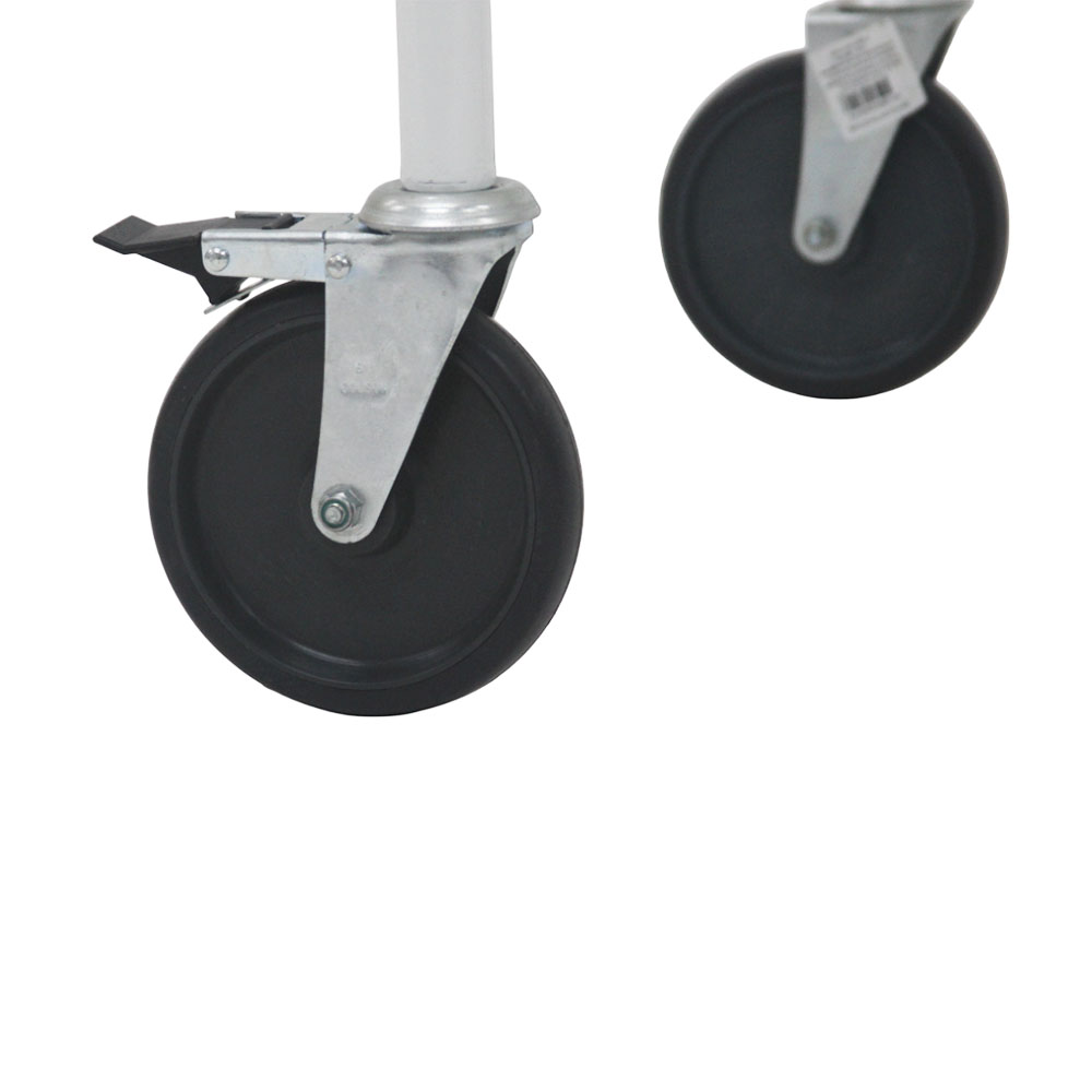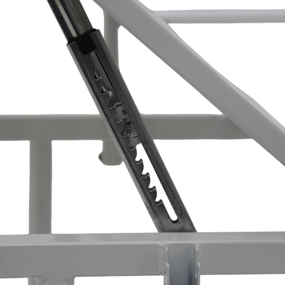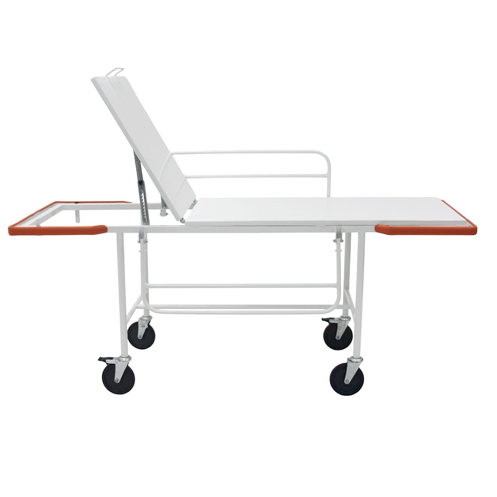 Equipada com rodízios de 6” (dois com freio em diagonal), com rolamento de esferas e para-choques de borracha em todo o perímetro, garantindo proteção contra impactos e excelente mobilidade. A elevação do dorso é feita por cremalheira mecânica, com ângulo máximo de 59°, proporcionando maior conforto ao paciente durante o uso.
