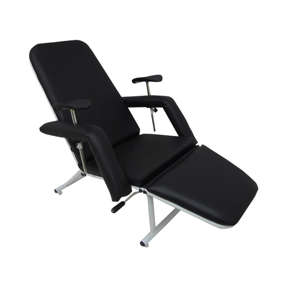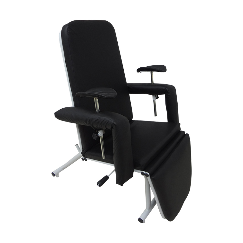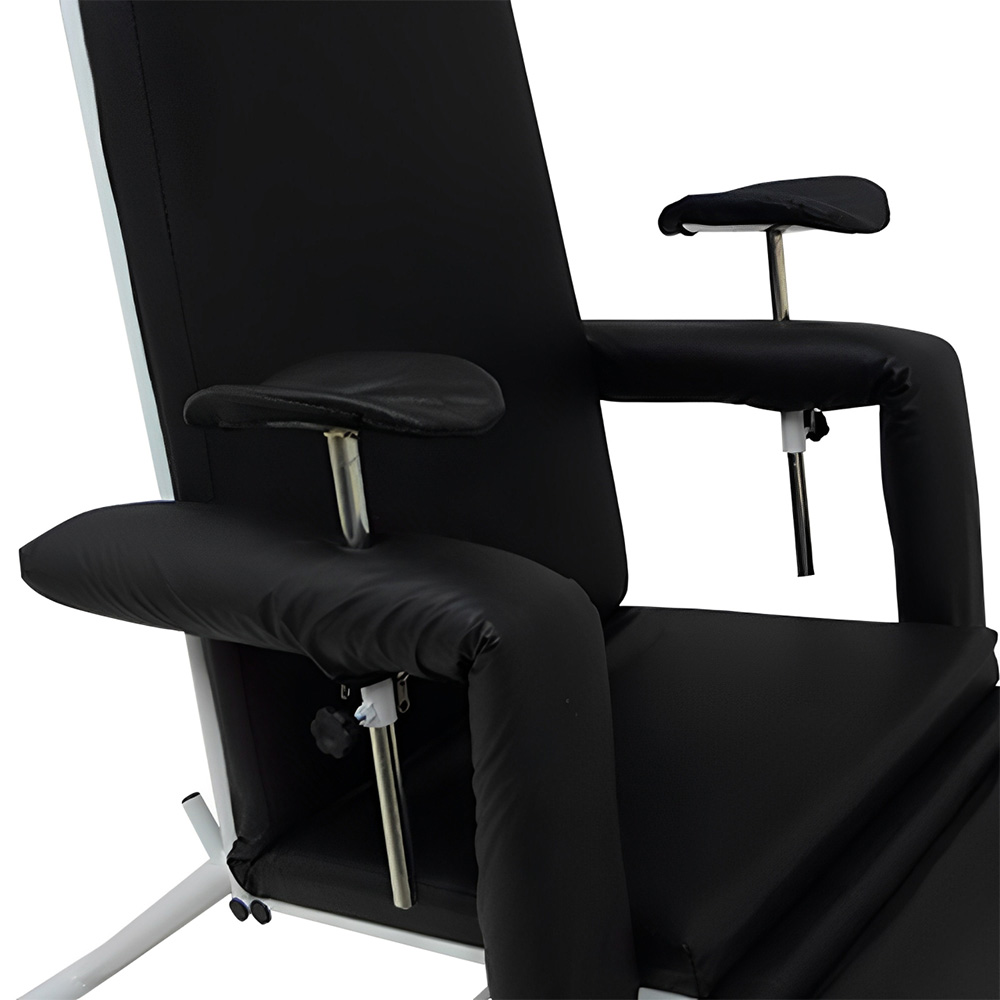 Poltrona para coleta de sangue, com estrutura robusta em aço carbono com tratamento antiferruginoso e acabamento em pintura eletrostática a pó epóxi, resistente a esforços mecânicos e à corrosão.