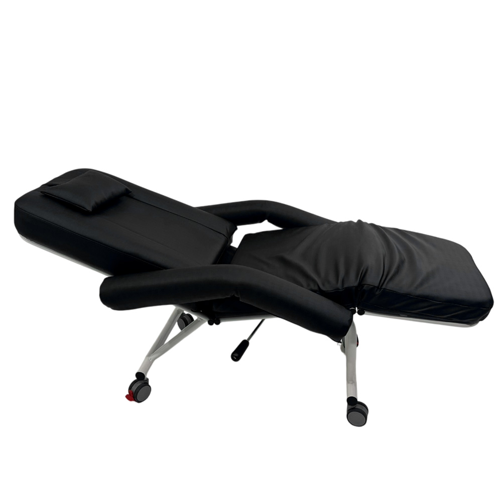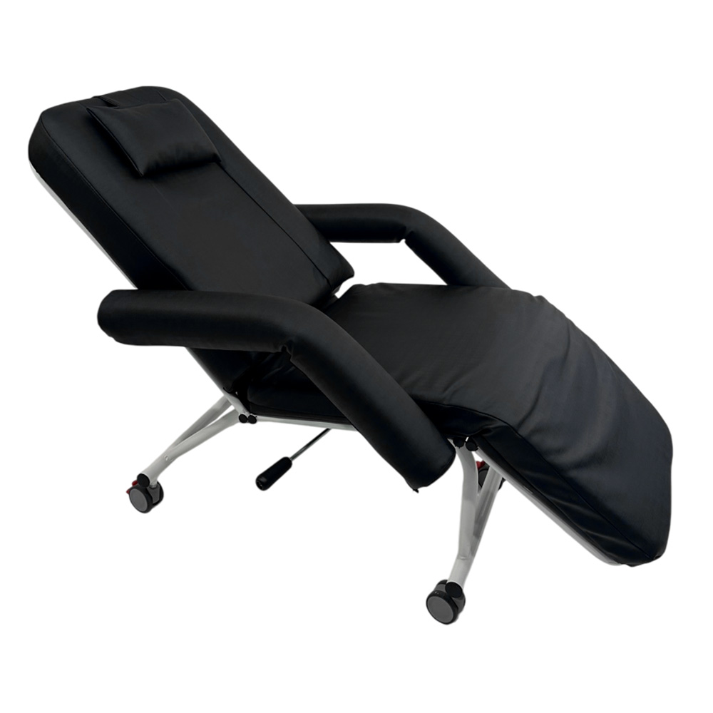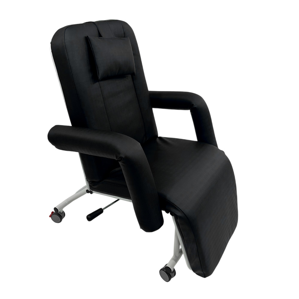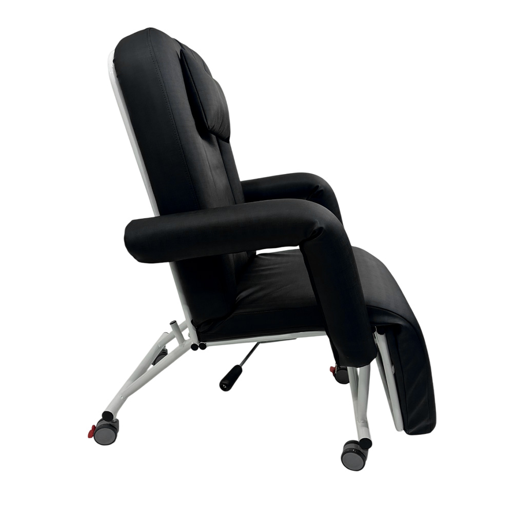 Poltrona reclinável para uso clínico, construída em aço carbono com tratamento antiferruginoso e acabamento em pintura eletrostática a pó epóxi, oferecendo alta resistência a impactos e à corrosão.